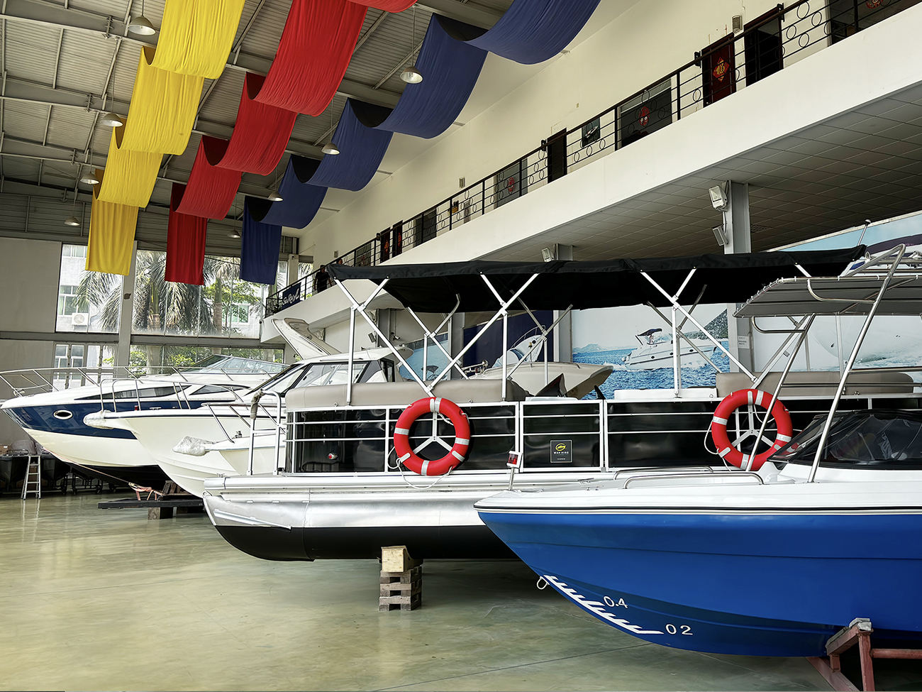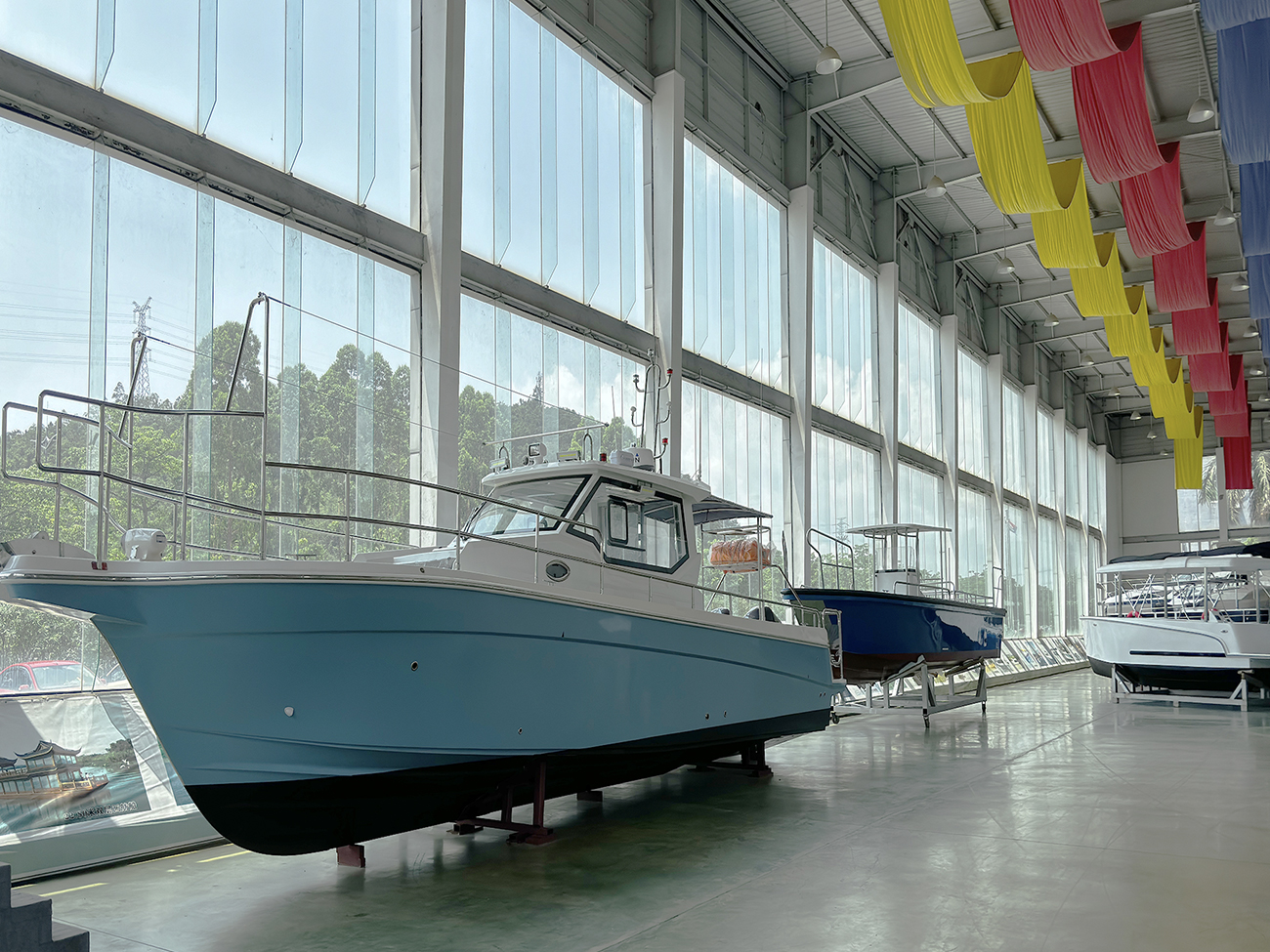 擁有資深生產團隊和專業生產車間,廠房面積50000平米,擁有碼頭岸線、成型車間、總裝車間、零件倉庫、化工倉庫、玻纖倉庫等生產場地,具備齊全的船模、成型機具等生產設備,年造船能力200艘以上。